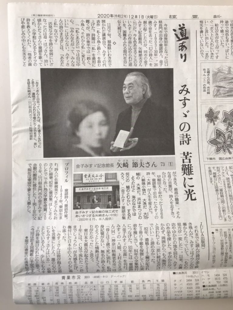 山口県、金子みすゞ記念館(金子みすゞ記念館・事務局長 草場睦弘)から読売新聞掲載記事が届きました。(山口県、九州、沖縄県 12/1掲載)